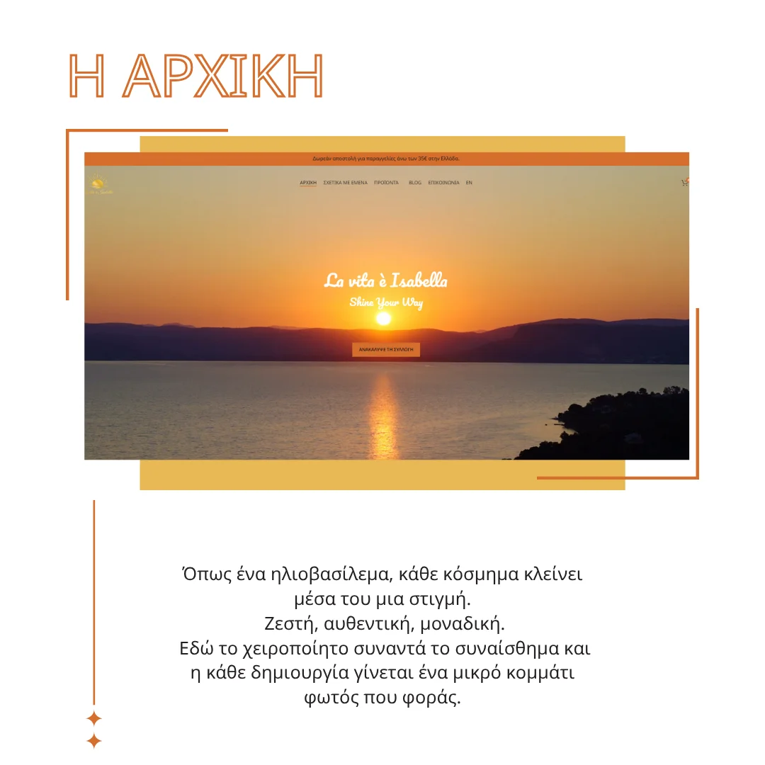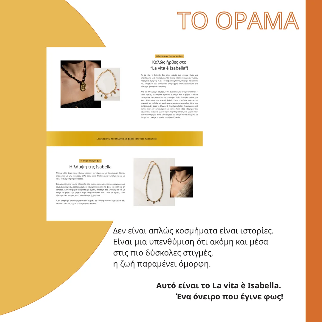 Καθ’ όλη τη διάρκεια της συνεργασίας, σταθήκαμε δίπλα στην La vita è Isabella, προσφέροντας συμβουλευτική υποστήριξη τόσο για την ψηφιακή της εικόνα όσο και για τα επόμενα βήματα μετά το live site. Κοινός μας στόχος ήταν η δημιουργία ενός ψηφιακού εργαλείου που να υποστηρίζει την ανάπτυξη του brand, να ενισχύει τις πωλήσεις και να εκφράζει την ταυτότητά του με συνέπεια.