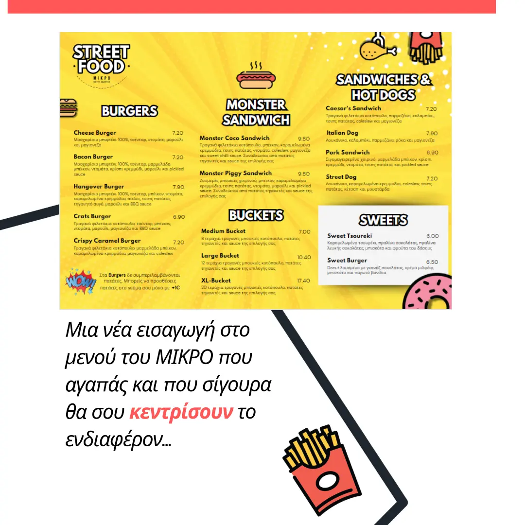 Μια ακόμη συνεργασία με το αγαπημένου ΜΙΚΡΟ που ήρθε για να μείνει! Έχοντας δοκιμαστεί στο πεδίο του καφέ και του σνακ με απόλυτη επιτυχία, έφτασε η ώρα να μπει δυναμικά και στο χώρο του Street Food με τις πιο δυνατές γεύσεις που έχεις γευτεί μέχρι σήμερα. Μας ζητήθηκε κάτι μοντέρνο, απλό αλλά και να μένει στο μάτι και στη μνήμη του καταναλωτή. Έπειτα από συναντήσεις του Site Project με όλο το marketing crew του ΜΙΚΡΟ, το αποτέλεσμα μπορείτε να το θαυμάσετε και μόνοι σας!