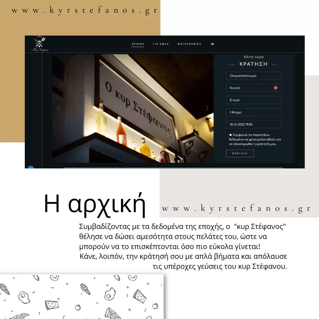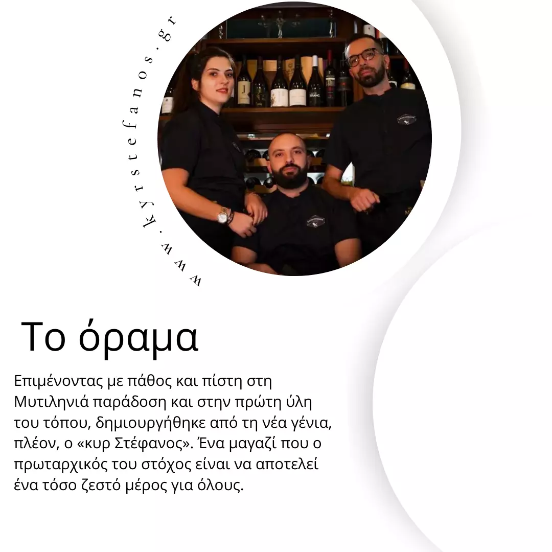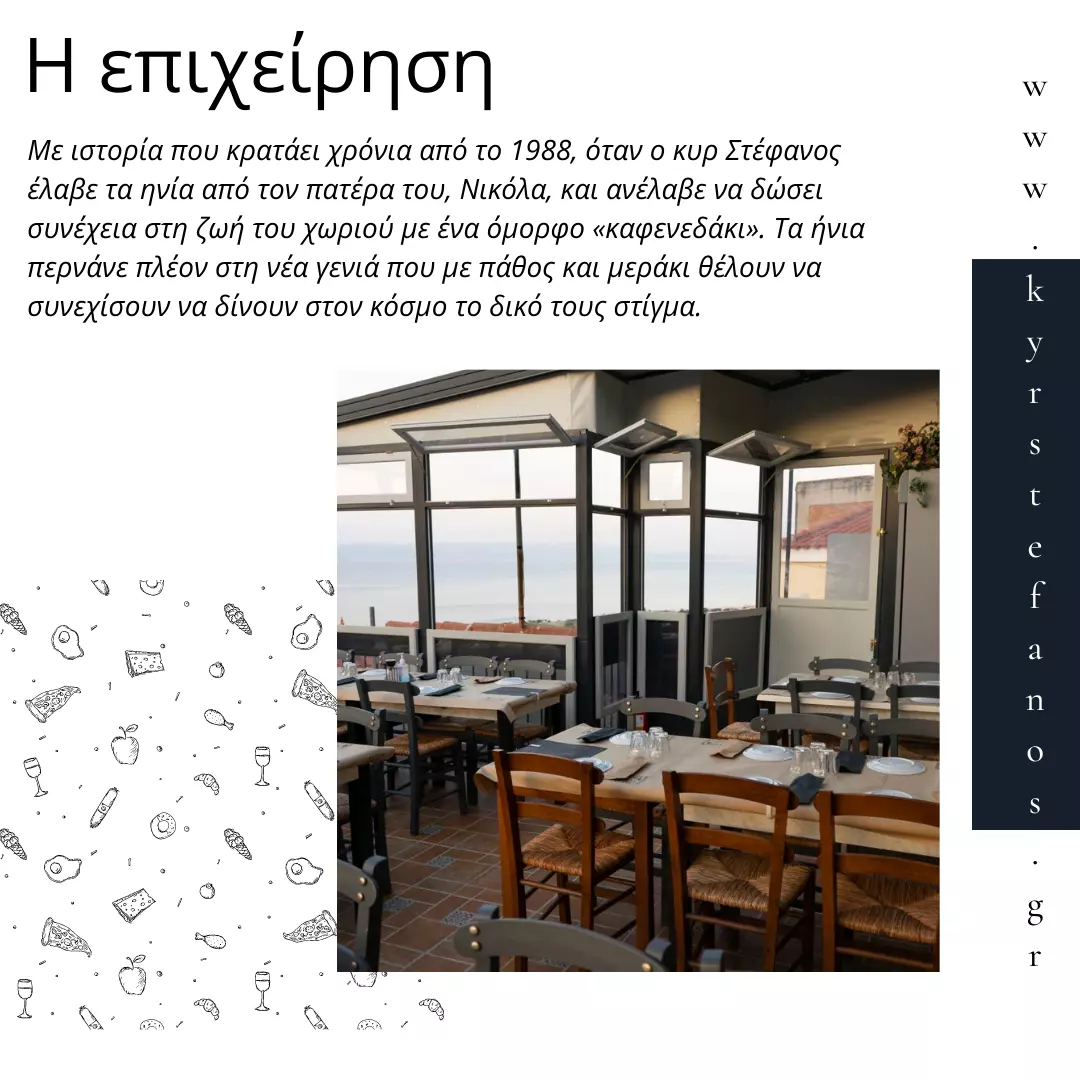Ο «κυρ Στέφανος» είναι ένα νέο οικογενειακό εστιατόριο στο Καγιάνι Μυτιλήνης που ήρθε για να αποτελέσει το σημείο αναφοράς για το καλό κρέας και τη φιλοξενία, που θα θεωρείται «κλασσικό», που θα αποκτήσει τη δική του ταυτότητα και θα καλύπτει εύρος ηλικιών και επιθυμιών, ικανοποιώντας αυτόν που ζητάει το απλό και εκείνον που επιθυμεί το «κάτι παραπάνω».