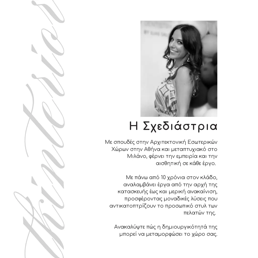 Με σπουδές στην Αρχιτεκτονική Εσωτερικών Χώρων στην Αθήνα και μεταπτυχιακό στο Μιλάνο, η Θάλεια Κατσιάρη διαθέτει πάνω από 10 χρόνια εμπειρίας στον τομέα του interior design. Σκοπός της είναι να δημιουργεί χώρους που συνδυάζουν τη λειτουργικότητα με την αισθητική, προσφέροντας πρακτικές και άνετες λύσεις που ανταγωνίζονται τις ανάγκες της καθημερινότητας.